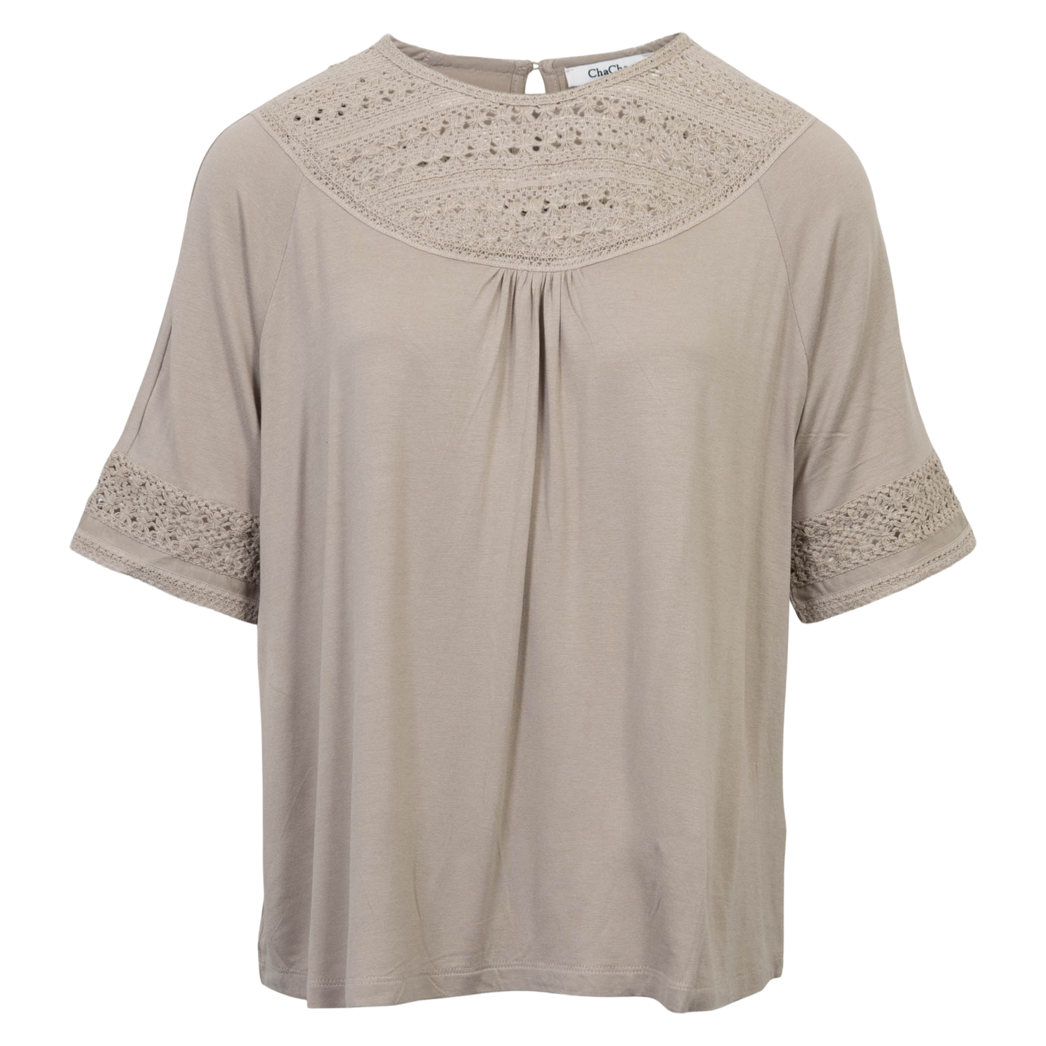 Flot dame t-shirt fra ChaCha med fine detaljer på fronten og ved ærmegab. Blusen får et ekstra strejf af elegance med læg foran. Som får blusen til, at falde flot på kroppen. Den kortærmede bluse har rund hals og lukkes med en enkelt knappe i nakken.