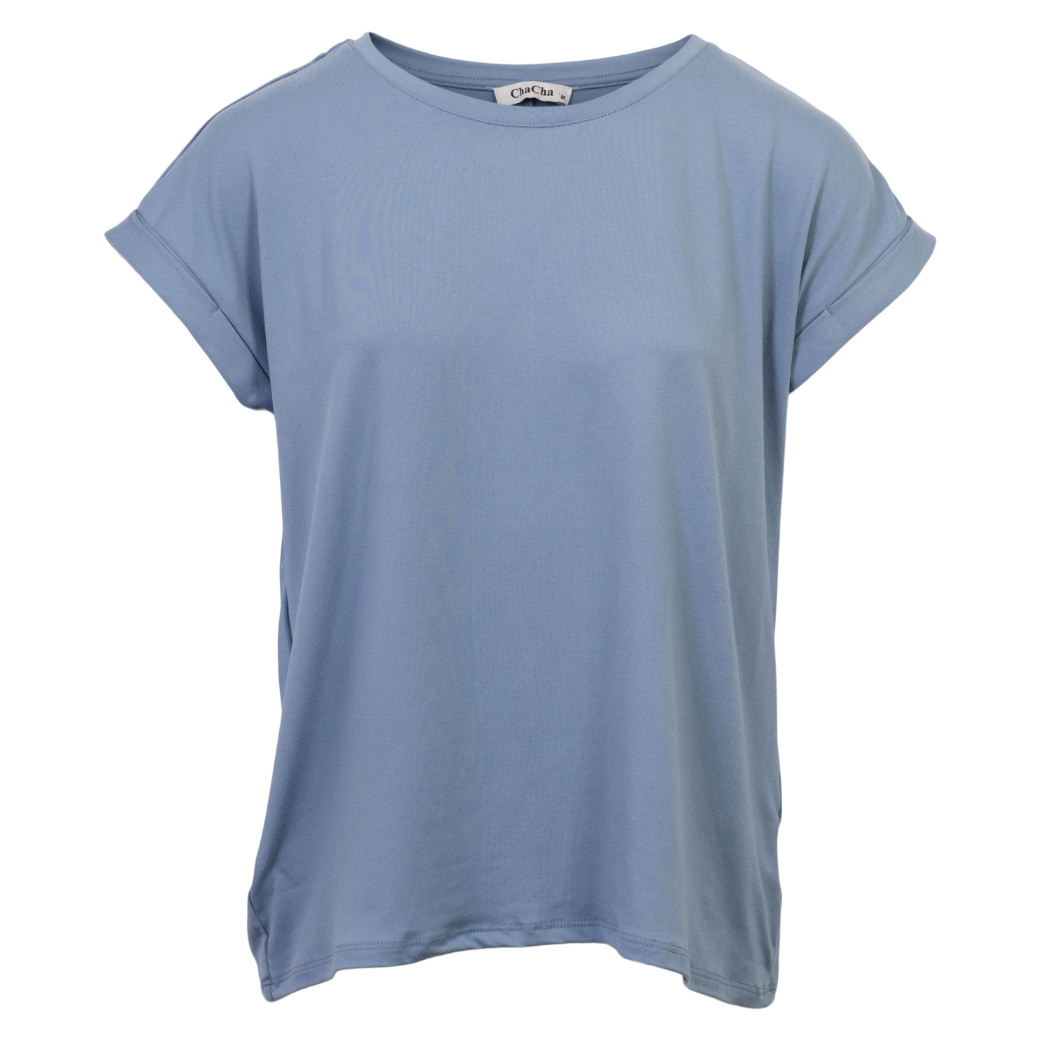 ZbyZ plus size dame T-shirt i ensfarvet blå og rund halsudskæring. Blusen har en løs pasform.