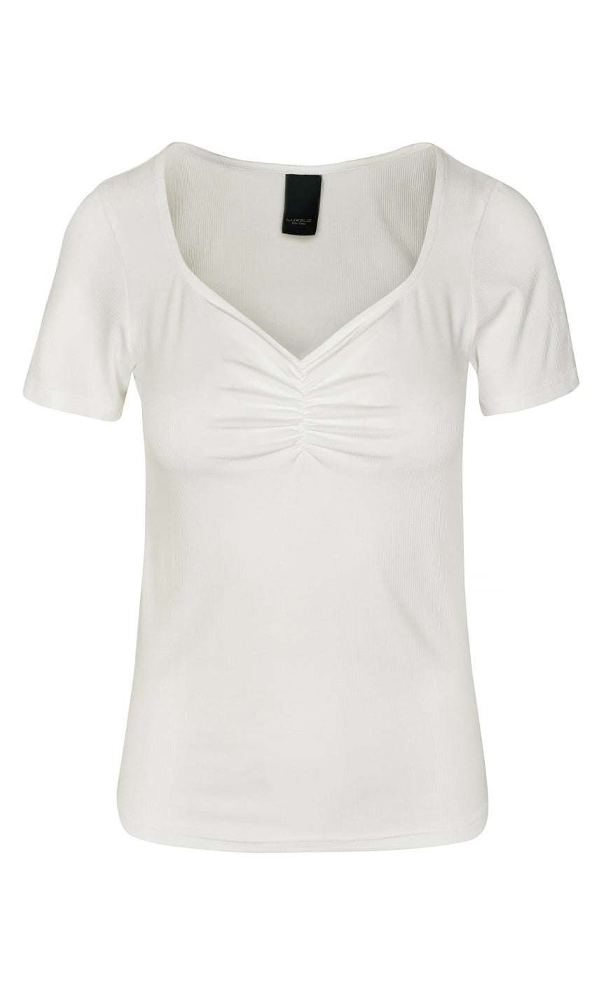 T-shirt fra Luxzuz Sød t-shirt fra Luxzuz i hvid i en ribbet kvalitet. T-shirten har en sød udskæringer og korte ærmer.