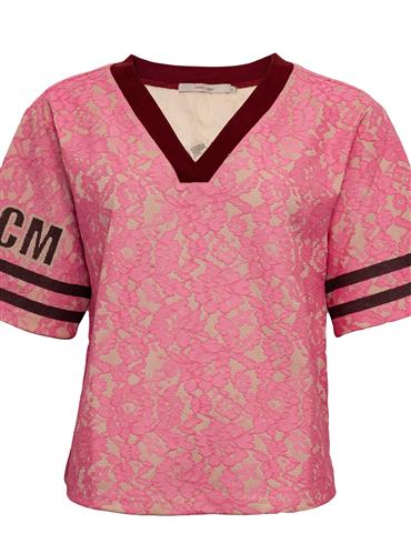Super smart t-shirt med v-hals. Blusen har kitfarvet bund og fin blonde i pink. Flotte detaljer med kontrast farve i halsudskæringen og brune striber på ærmerne. Bagpå har t-shirten infinity logoet. Kvalitet. 60 bomuld – 40 polyester Vaskes ved 30 gr.