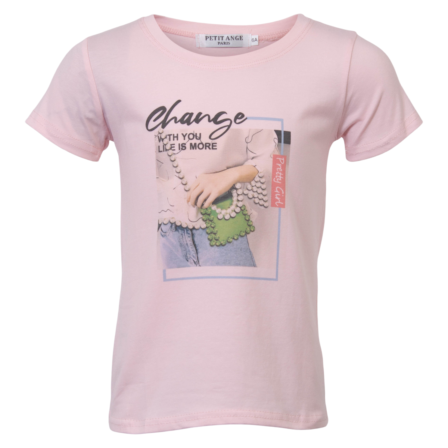 Pige T-shirten har print på fronten. Samt rund haludskæring med en lille ribkant.
